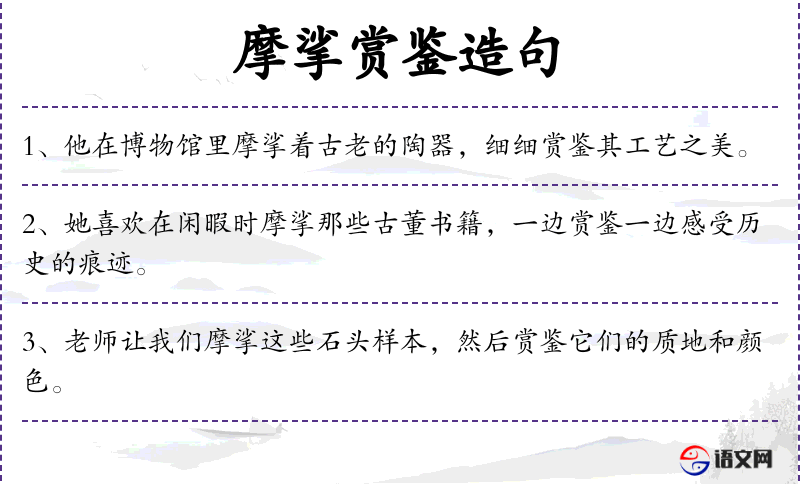 - 反义词:摩挲(推开)、复制品(原作)、赏鉴(忽视)、神韵(平淡)