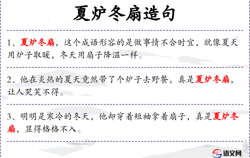 - 夏炉冬扇:这个成语源自**古代,比喻做事不合时宜。在冬天使用扇子或夏天使用火炉都是不合时宜的行为。