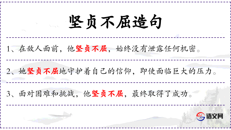 - 坚贞不屈:形容词性短语,表示坚定不移,不屈服。