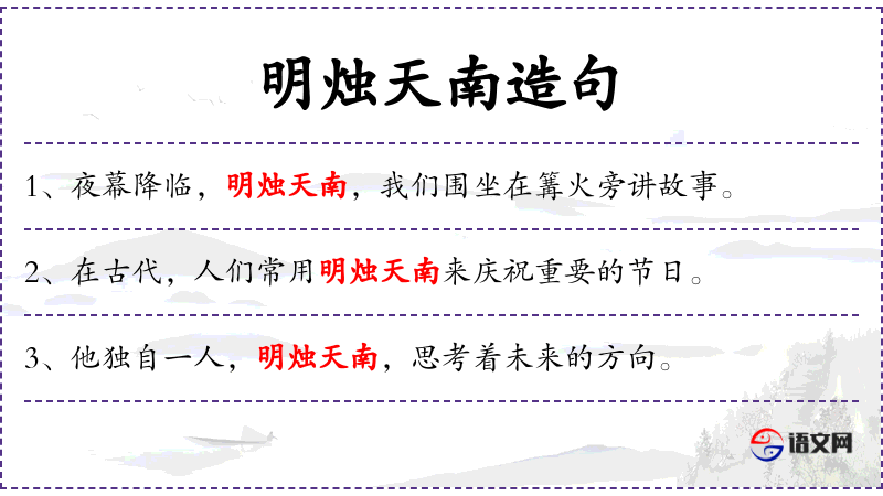 - 明烛天南:成语,形容夜晚明亮,比喻环境或心境明亮。