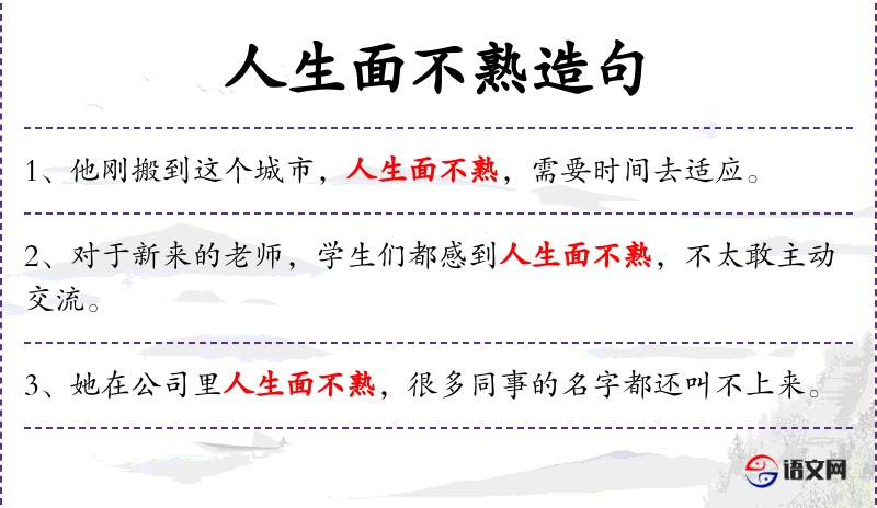 “人生面不熟”是一个中文成语,形象地表达了不熟悉或不了解的状态。这反映了中文表达中喜欢使用成语来增加语言的丰富性和表现力。