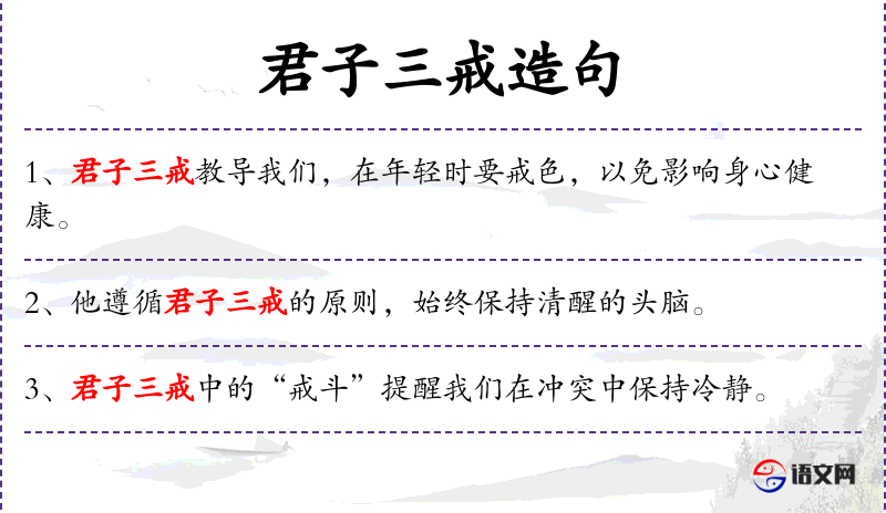 - 君子三戒:名词短语,指儒家文化中君子应遵守的三条戒律。