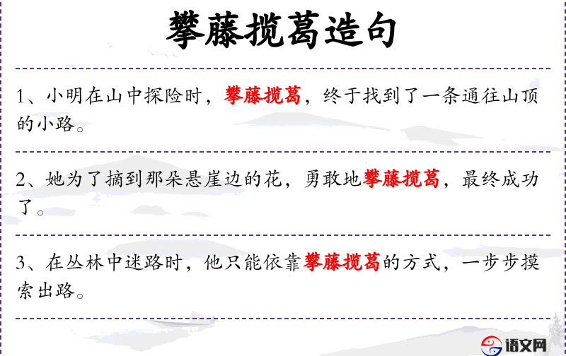 句子:“他为了证明自己的勇气,决定攀藤揽葛,攀登那座险峻的山峰。”