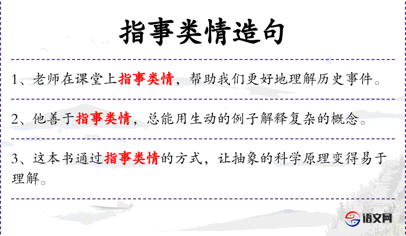 - 指事类情:用具体的事例来说明或类比抽象的情感或概念。