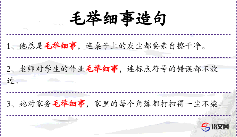 3. 【毛举细事】 - 毛:琐碎;细事:小事。指烦琐地列举细微的小事情。同“毛举细故”。