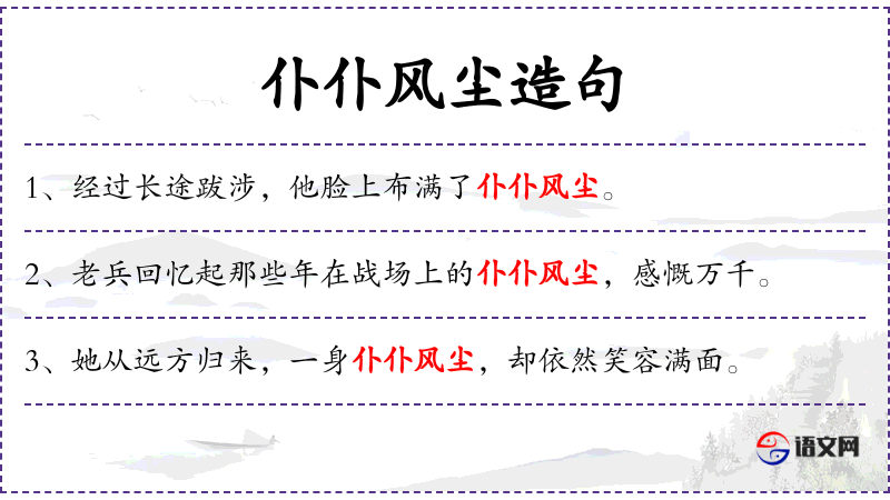 - 仆仆风尘:成语,形容旅途劳累,满身尘土。