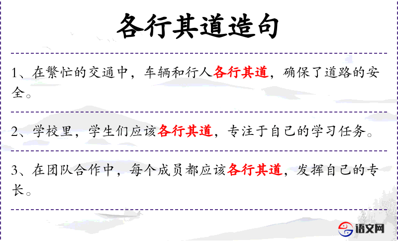 - 各行其道:比喻各自按照自己的方式或职责行事。