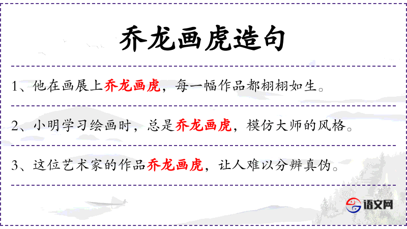 句子:“小明学*绘画时,总是乔龙画虎,模仿大师的风格。”
