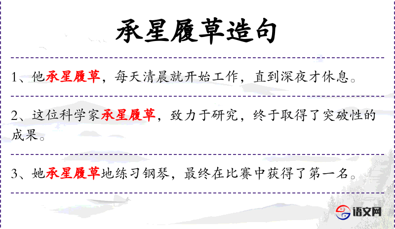 - 承星履草:这是一个成语,意思是形容农民辛勤劳动,不分昼夜地在田间劳作。