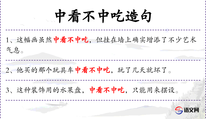 - 宾语:无明确宾语,但“中看”和“中吃”可以理解为谓语的补足语。