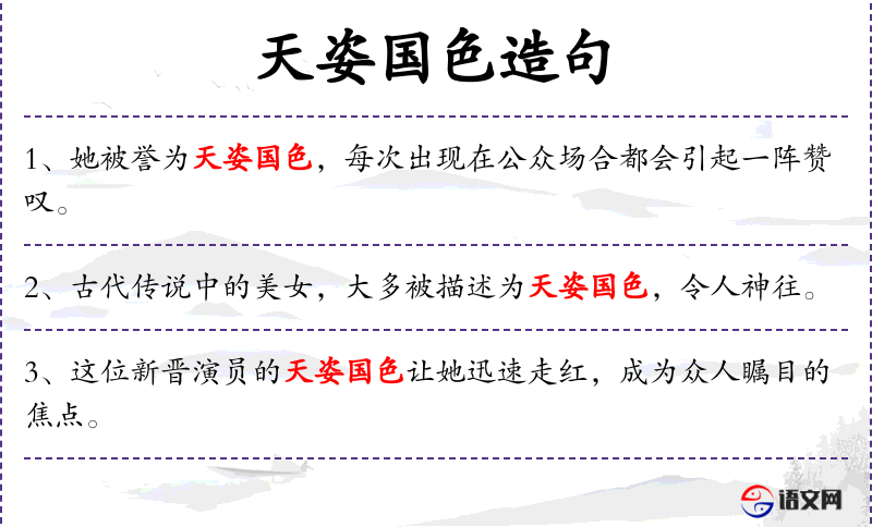 - 天姿国色:形容女子非常美丽,常用于文学作品中。