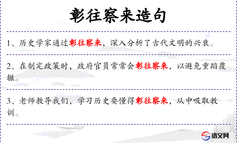 - 彰往察来:成语,意思是回顾过去,展望未来,以增加对事物的理解和认识。