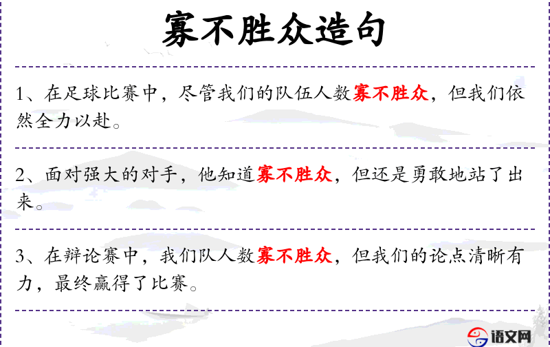 - 寡不胜众:成语,形容人数少的一方难以战胜人数多的一方。