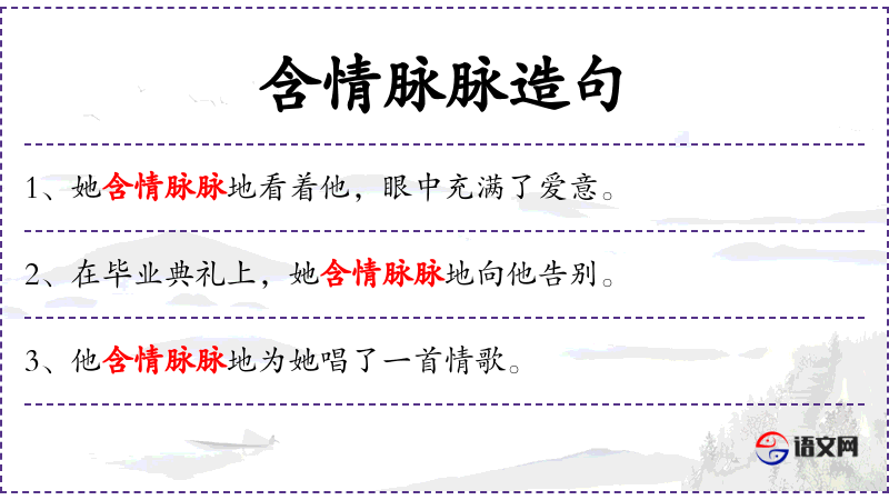 - 含情脉脉地:状语,形容她用充满情感的眼神和态度。