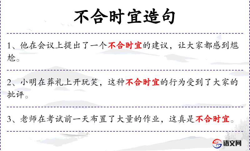1. 【不合时宜】 - 时宜:当时的需要和潮流。不适合时代形势的需要。也指不合世俗习尚。