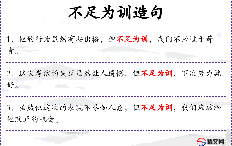 - 宾语:无明显宾语,但“不足为训”隐含了一个宾语“训”,即“教训”。