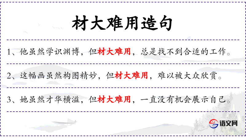 1. 【材大难用】 - 原意是能力强难用于小事。后形容怀才不遇。