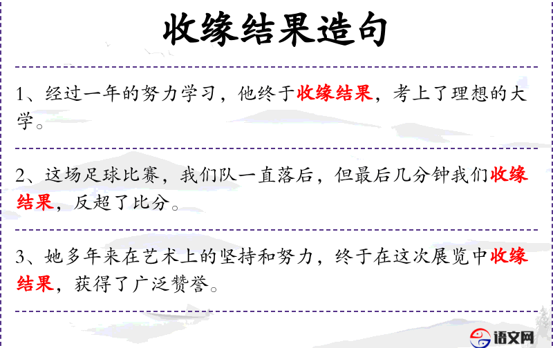 - 收缘结果:这个表达可能源自**文化,意指因果报应,这里引申为努力后的成果。