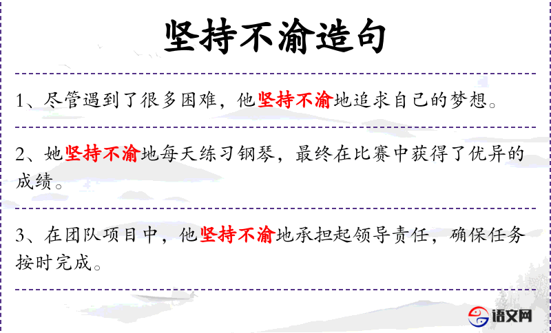 - 句子中“坚持不渝”体现了**文化中对坚定和毅力的重视。