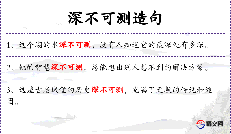 1. 【深不可测】 - 深得无法测量。比喻对事物的情况捉摸不透。