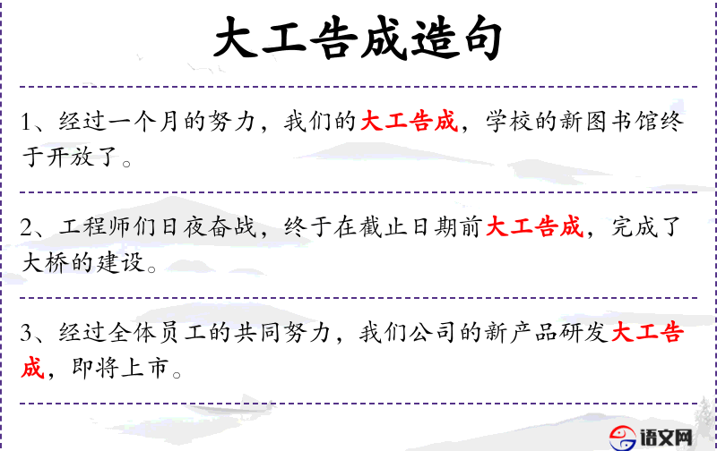 句子中的“大工告成”是一个成语,源自**传统文化,用来形容大型工程或重要工作的圆满完成。这个成语体现了对工程成就的赞扬和尊重。