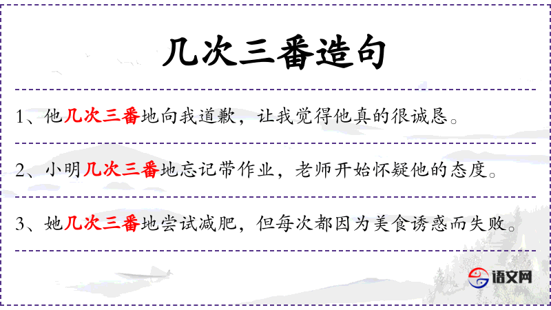 - 状语:几次三番地、每次、因为美食诱惑