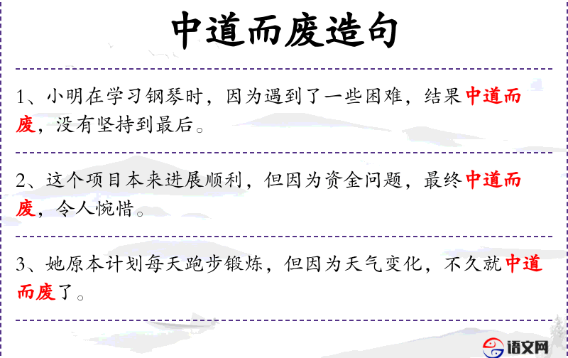 - “中道而废”反映了**文化中对坚持和毅力的重视,中途放弃通常被视为不理想的结果。