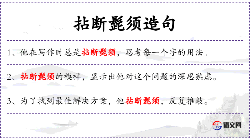 句子:“拈断髭须的模样,显示出他对这个问题的深思熟虑。”