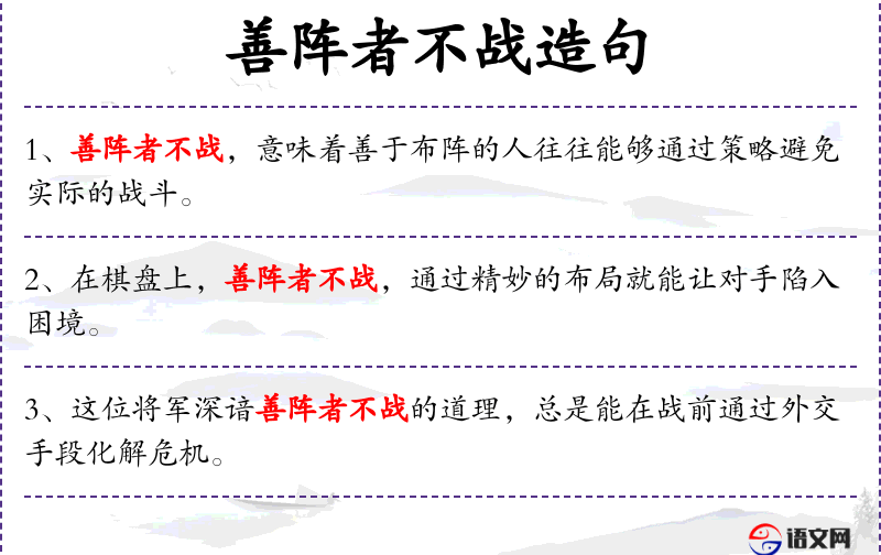 句子中的“善阵者不战”源自《孙子兵法》,体现了**古代军事思想中的“不战而屈人之兵”的理念。这种思想强调通过智慧和策略避免战争,达到和平解决问题的目的。