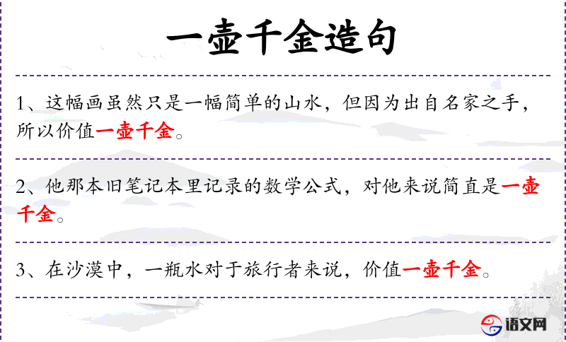 1. 【一壶千金】 - 壶:通“瓠”,瓠瓜,中空,能浮在水面。比喻东西虽然轻微,用得到的时候便十分珍贵。
