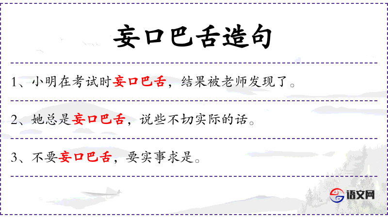 - 妄口巴舌:成语,形容说话不真实或胡说八道。