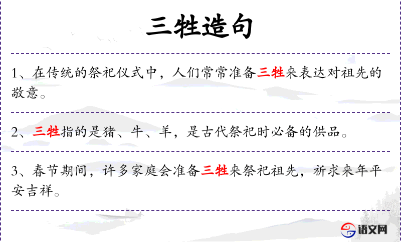 1. 【三牲】 指用于祭祀的牛、羊、猪。