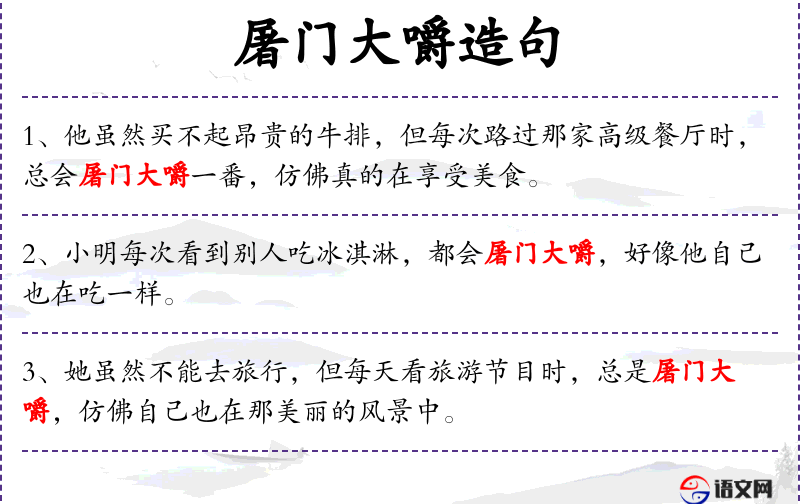 - 屠门大嚼:成语,形容非常贪婪地享受某种感觉或体验。