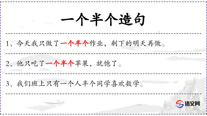 - 半个:数量词,表示不完全的数量。