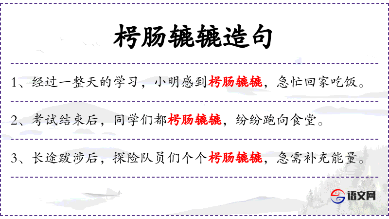 1. 【枵肠辘辘】 - 枵:空虚;辘辘:车行声。肚子饿得辘辘作响。形容十分饥饿。