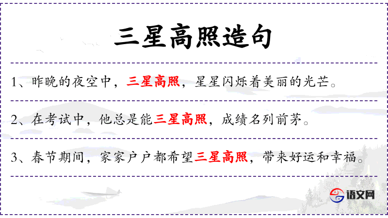 1. 【三星高照】 - 三星:原指明亮而接近的三颗星,也指福星、禄星、寿星三个神仙。指有福、禄、有寿,命运好。