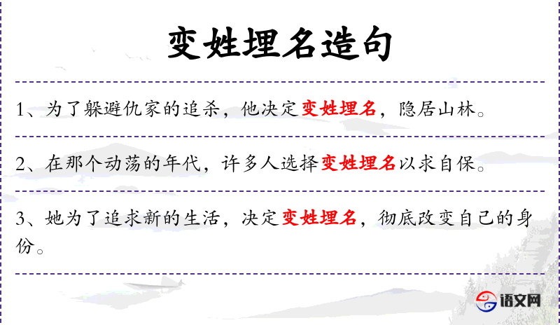 - 变姓埋名:成语,指改变姓名,隐藏身份。