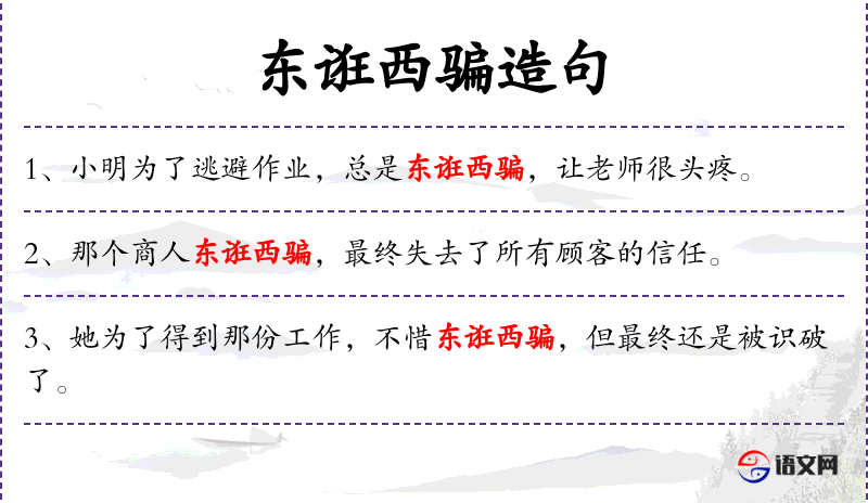 - 使用“东诳西骗”这样的成语增加了句子的文化色彩和表达的深度。