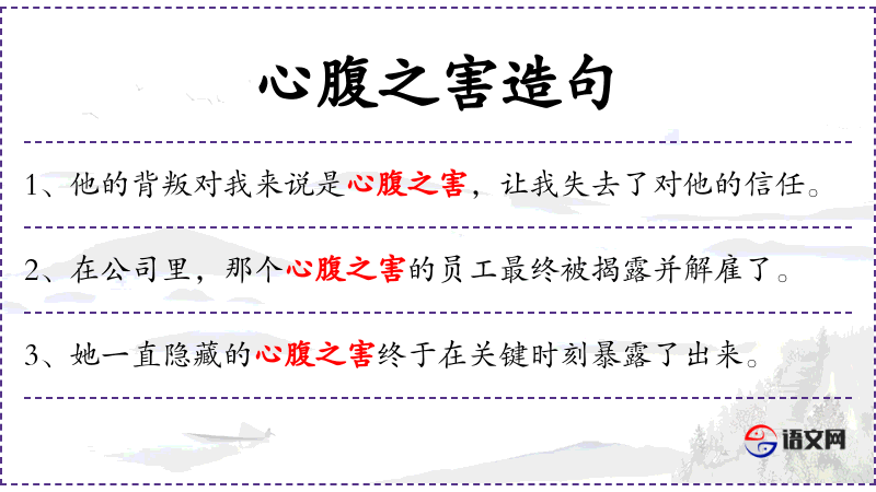 - 宾语:那个看似忠诚的朋友其实是他的心腹之害