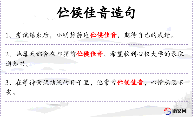 1. 【伫候佳音】 伫:久立而等待。久久站着等候好的消息。