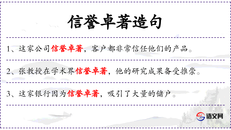 1. 【信誉卓著】 卓著:突出显著。信用与名誉特别好。