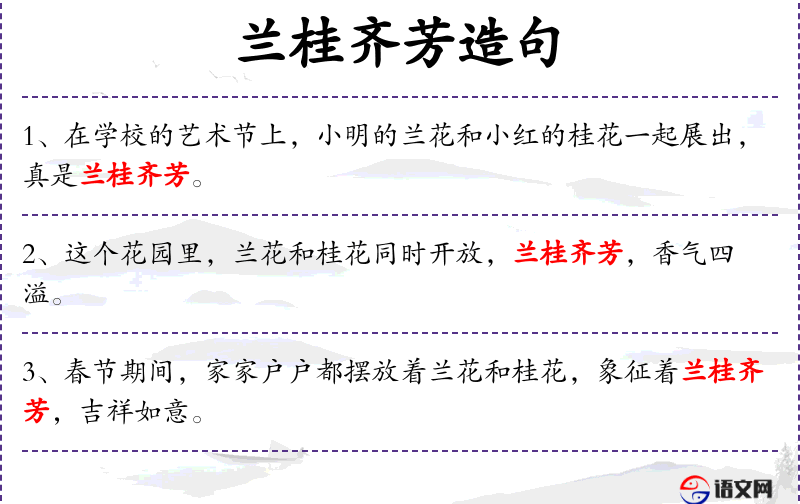 句子:“春节期间,家家户户都摆放着兰花和桂花,象征着兰桂齐芳,吉祥如意。”