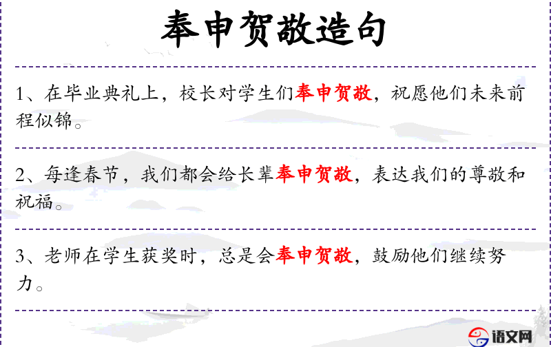 - 奉申贺敬:一种礼貌的表达方式,表示尊敬和祝贺。