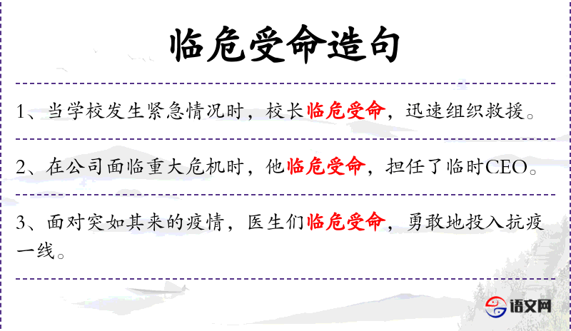 - 临危受命:在紧急情况下接受任务,通常指在困难或危险的情况下承担重要任务。
