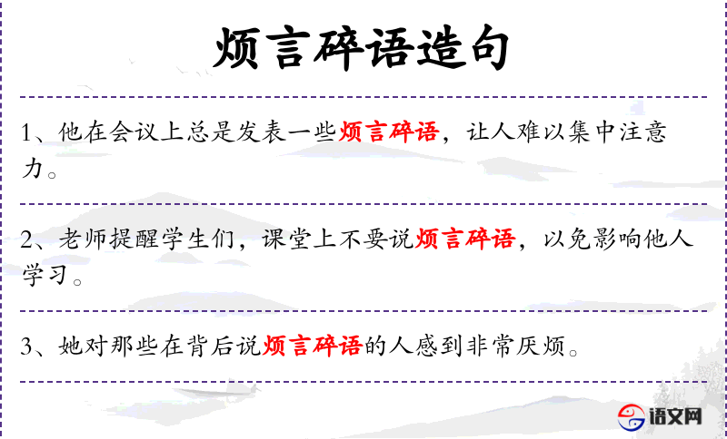 5. 【烦言碎语】 烦:多,繁剧;碎:琐碎。形容文词杂乱、琐碎。
