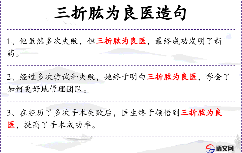 1. 【三折肱为良医】 - 几次断臂,就能懂得医治断臂的方法。后比喻对某事阅历多,富有经验,自能造诣精深。