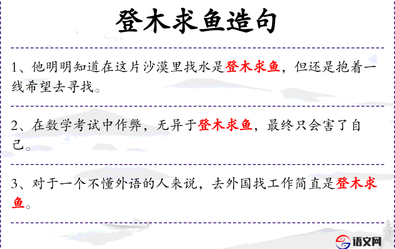 4. 【登木求鱼】 - 登:攀;木:树。爬到树上找鱼。比喻方向、方法不对,无法达到目的。