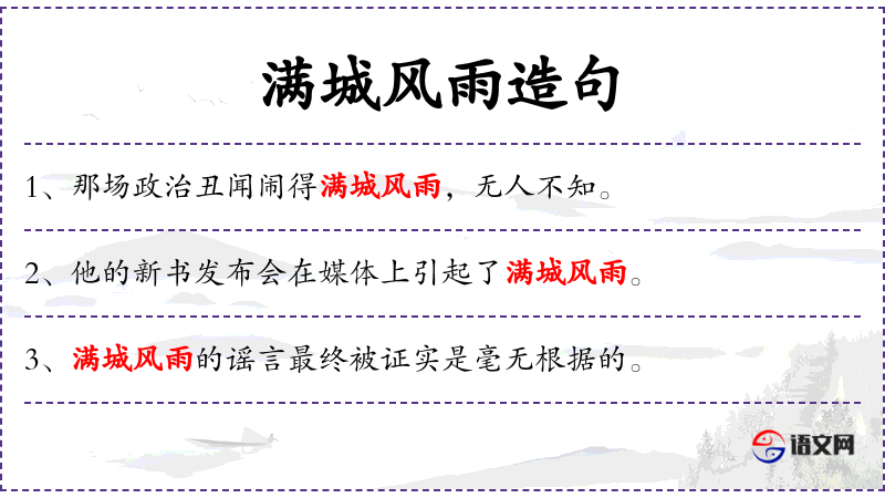 3. 【满城风雨】 - 城里到处刮风下雨。原形容重阳节前的雨景。后比喻某一事件传播很广,到处议论纷纷。