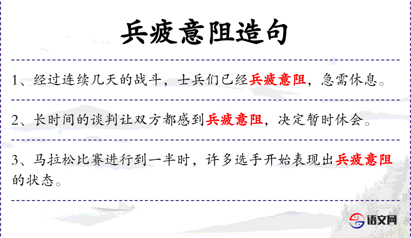句子:“经过一整天的学*,学生们已经兵疲意阻,需要放松一下。”