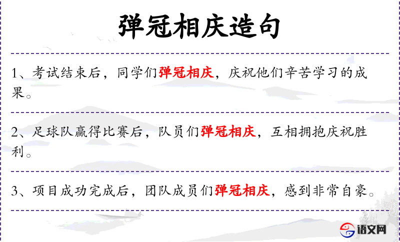 - 弹冠相庆:这是一个成语,意思是互相祝贺,特别是指在成功或喜庆的时候。